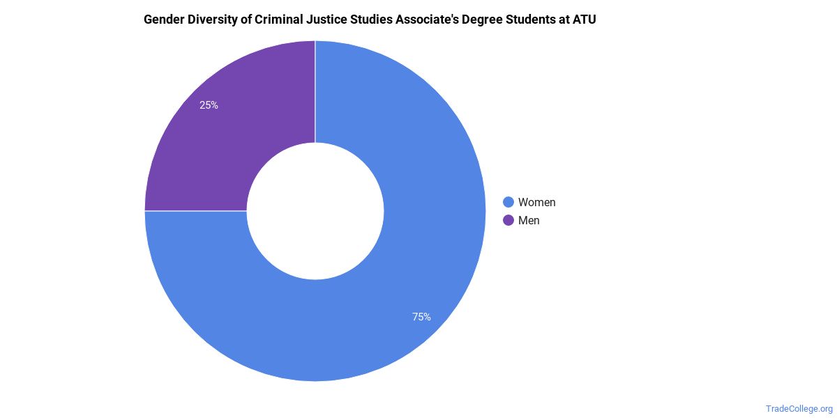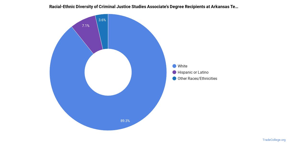The majority of those who receive an associate's degree in criminal justice studies at ATU are white. Around 89% fell into this category, which is below average for this degree.